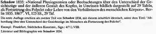 Titel: Johann Gottfried Schadow, »National-Physiognomieen oder Beobachtungen über den Unterschied der Gesichtszüge und die äußere Gestaltung des menschlichen Kopfes, in Umrissen bildlich dargestellt auf neun und zwanzig Tafeln, als Fortsetzung des Policlet oder Lehre von den Verhältnissen des menschlichen Körpers.« Berlin.